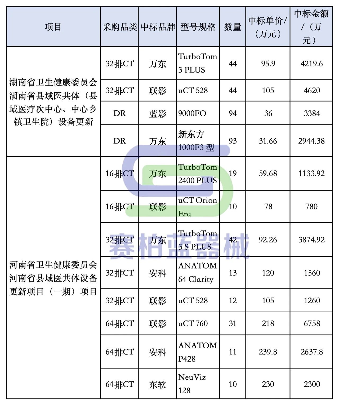 湖南省衛生健康委員會湖南省縣域醫共體(縣域醫療次中心、中心鄉鎮衛生院)設備更新共采購32排CT及DR275臺,預算金額2.79億元,中標金額約1.52億元,對比預算金額整體降價45.69%,萬東、聯影、藍影3家企業中標。