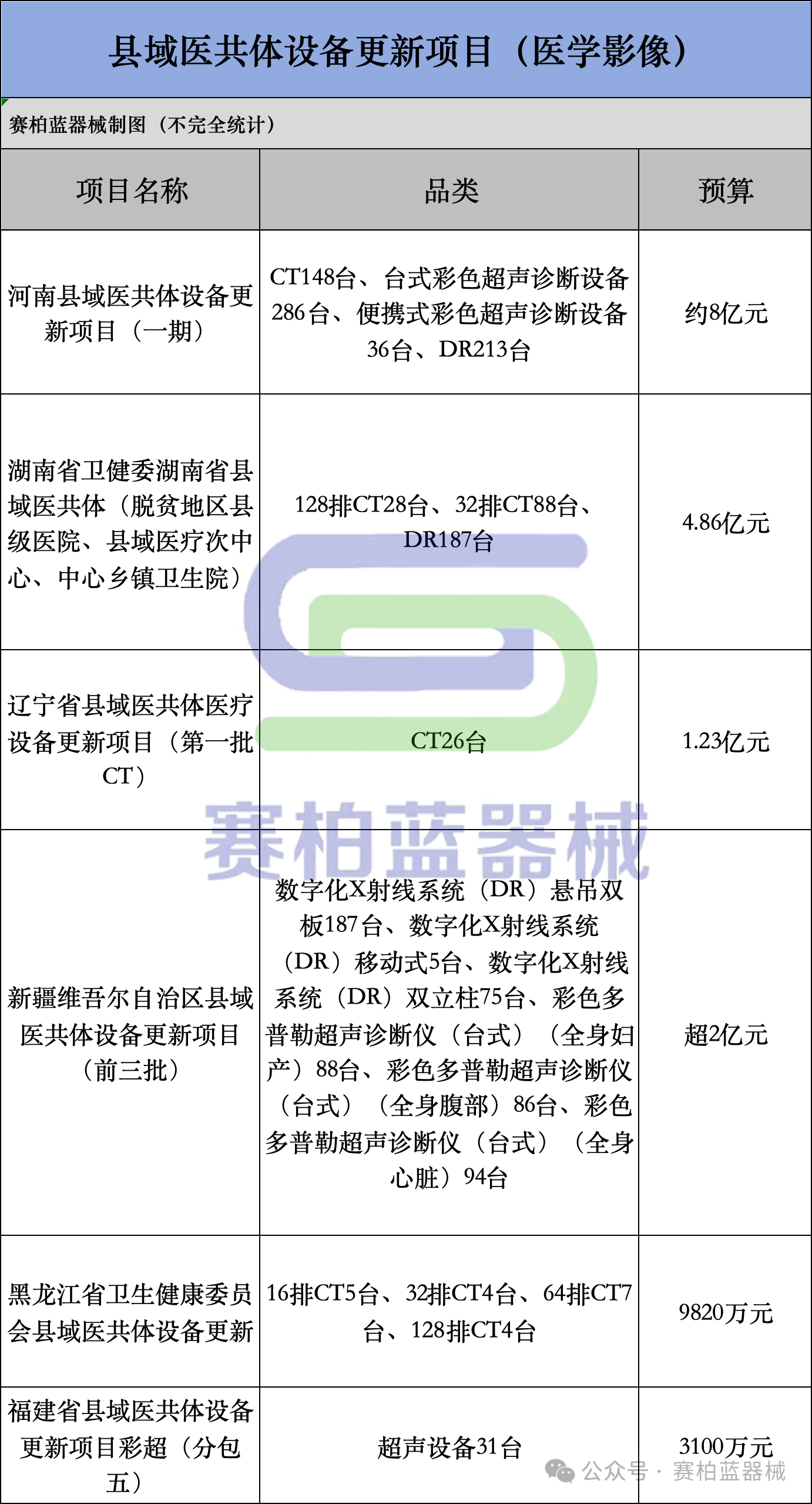 值得注意的是,除了剛中止采購的CT和生化分析儀外,河南省縣域醫共體設備更新項目(一期)項目還包含DR、便攜式彩色超聲診斷設備、臺式彩色超聲診斷設備和救護車,總預算為9.09億元。