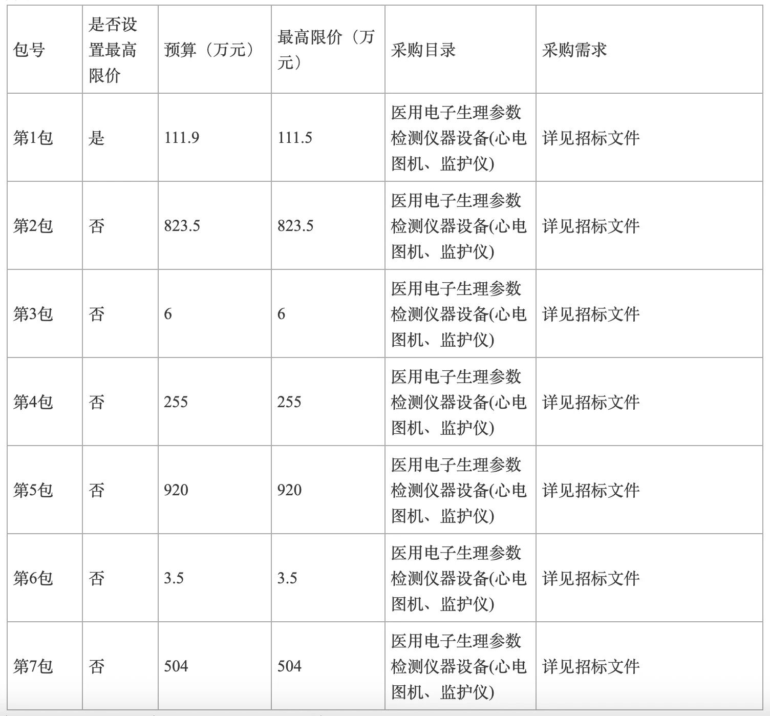 根據《公告》,本次采購目錄為醫用電子生理參數檢測儀器設備(心電圖機、監護儀),共分7個采購包,預算金額2623.9萬元,最高限價為2623.5萬元,開標時間定為2025年10月21日8點30分。具體如下: