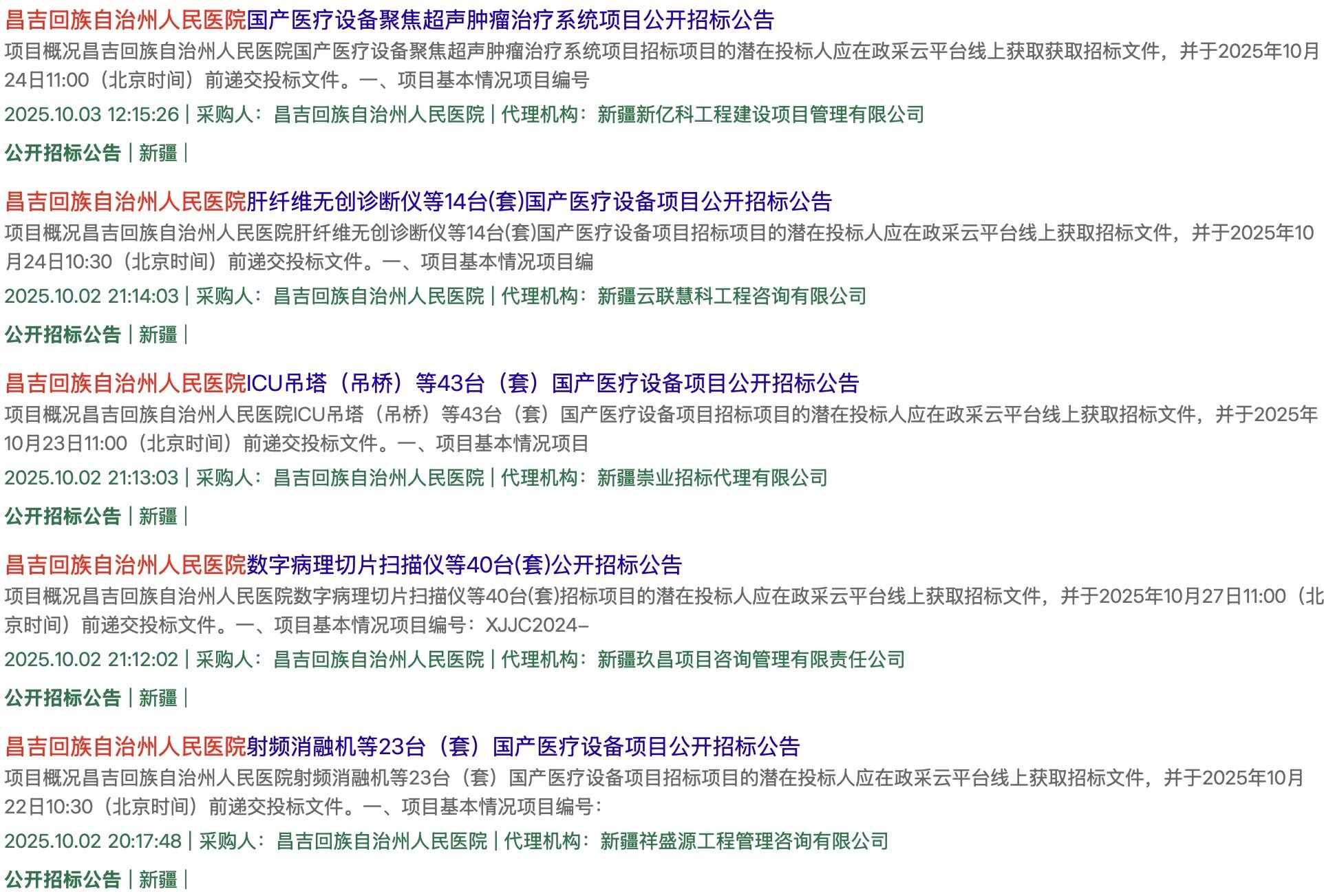 近段時間,各大三甲醫院設備采購項目還在陸續披露。10月1日-3日,新疆昌吉回族自治州人民醫院連發數個招標公告,涉及ICU吊塔、數字病理切片掃描儀、射頻消融機、SPECT/CT等數百臺設備。