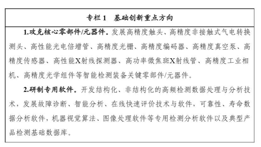 《行動計劃》指出,實施產業基礎創新工程,建立以企業為主體、市場為導向、知識產權利益分享機制為紐帶、政產學研用協同的智能檢測裝備產業創新體系,建設一批技術創新機構,加強智能檢測理論方法、先進檢測技術研究和科技創新成果轉化,突破一批關鍵核心零部件和專用軟件,增強產業鏈供應鏈韌性和安全水平。