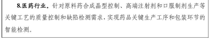 《行動計劃》提出,實施技術裝備推廣工程,加強技術試驗驗證和工程化攻關,促進智能檢測裝備技術熟化和性能迭代提升。開展創新產品應用示范及普及推廣行動,推動智能檢測裝備在機械、汽車、航空航天、電子、鋼鐵、石化、紡織、醫藥等行業應用示范和規模化推廣。