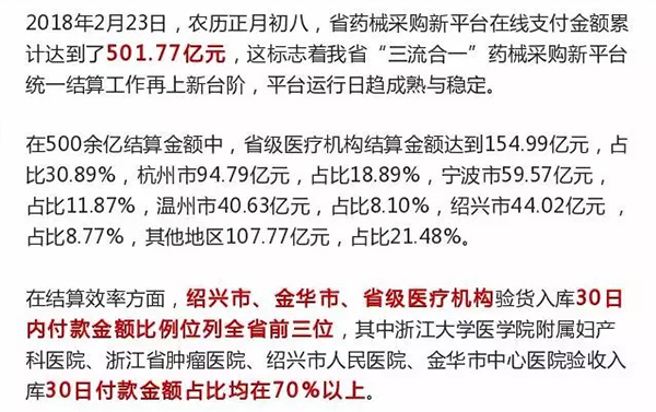 先是2月初,醫用耗材采購新平臺6家三甲醫院試點成功,并明確下一步就要在浙江省內進行全面推廣!而就在昨天,浙江省藥械采購網又發布消息,三流合一新平臺在線支付金額累計達到了501.77億元,醫院30天回款超70%!