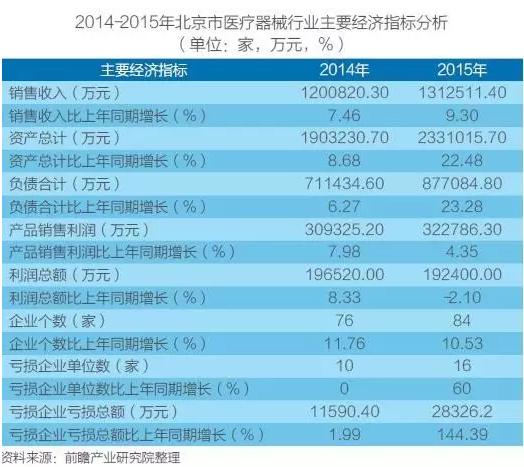 根據(jù)國(guó)家統(tǒng)計(jì)局統(tǒng)計(jì),2015年北京市醫(yī)療器械行業(yè)規(guī)模以上企業(yè)數(shù)量有84家;實(shí)現(xiàn)銷(xiāo)售收入131.25億元,同比增長(zhǎng)9.30%;實(shí)現(xiàn)產(chǎn)品銷(xiāo)售利潤(rùn)32.28億元,同比增長(zhǎng)4.35%;利潤(rùn)總額為19.24億元,同比下降2.10%。(具體數(shù)據(jù)指標(biāo)詳見(jiàn)下表。)