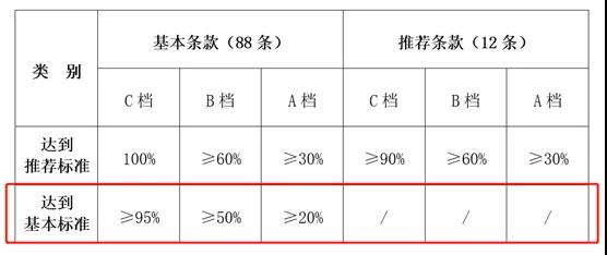 新版標準總共100條,分為88條基本條款和12條推薦條款,采用ABCD四個檔次進行記分,A檔代表“優秀”,B檔代表“良好”,C檔代表“合格”,D檔代表“不合格”。