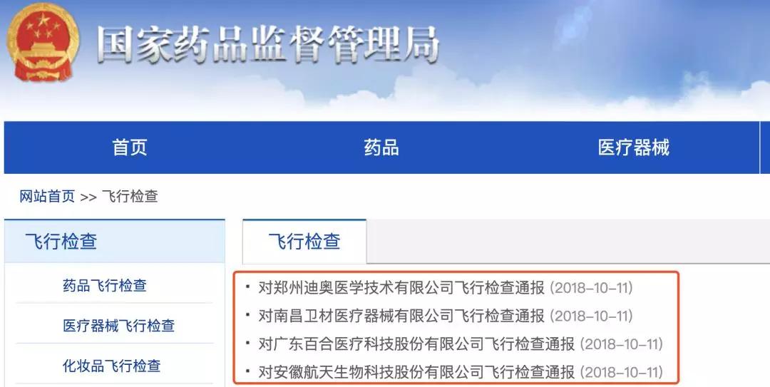 根據(jù)通報,4家被飛檢的公司分別是鄭州迪奧醫(yī)學(xué)技術(shù)有限公司、南昌衛(wèi)材醫(yī)療器械有限公司、廣東百合醫(yī)療科技股份有限公司、安徽航天生物科技股份有限公司。