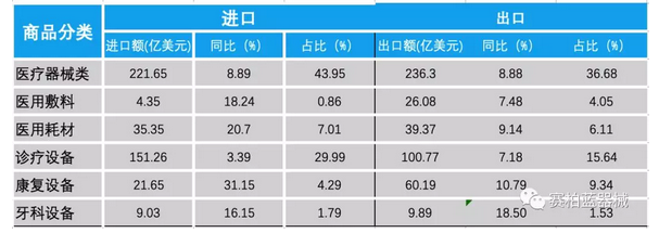 總出口額中,醫用敷料、醫用耗材、診療設備、康復設備、牙科設備出口均實現穩步增長,分別提升7.48%、9.14%、7.18%、10.79%、18.50%。