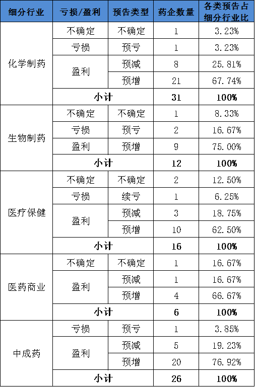 需要注意的一個現(xiàn)象是在盈利的企業(yè)中,除生物制藥細分行業(yè)外,其余細分行業(yè)預告盈利的企業(yè)中預減企業(yè)占比也較高。化學制藥、醫(yī)療保健、醫(yī)藥商業(yè)和中成藥預減合計占細分行業(yè)的比例分別為25.81%、18.75%、16.67%和19.23%。