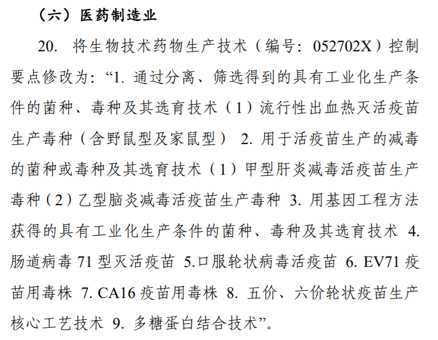(商務部科技部公告2020年第38號,以下簡稱《目錄》)。本次《目錄》共涉及53項技術條目:與醫藥制造業相關的禁止出口的技術條目3項;限制出口的技術條目5項。