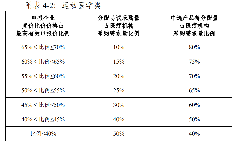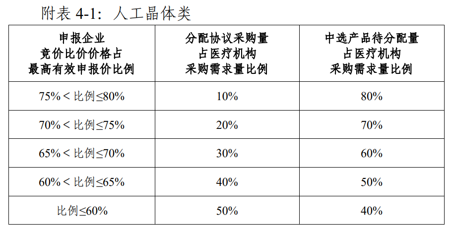 與脊柱國采類似,此次集采擬中選規則中的規則二,是行業俗稱的“躺平復活”機制。其中,人工晶體降40%、運動醫學降60%可獲得擬中選資格(具體折算規則、適用范圍見文件)。此外,第四批國采還增加了規則三:對于申報企業不超過2家的競價單元,人工晶體降20%、運動醫學降30%可獲得擬中選資格。