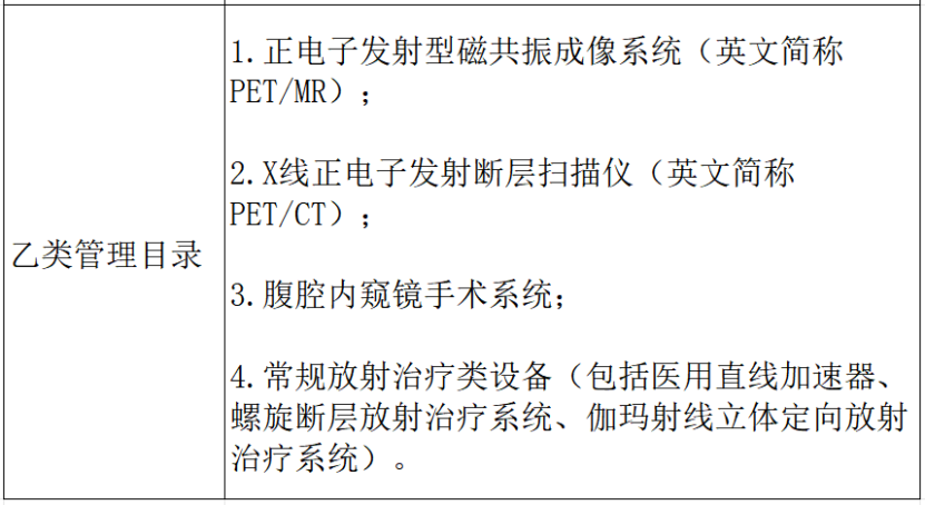 國家衛健委發布的《大型醫用設備配置許可管理目錄(2023年)》,積極落實“放管服”改革要求,對技術成熟、性能穩定、應用規范的設備,積極推動由甲類改為乙類或由乙類調出目錄。與2018年版目錄相比,新版目錄的管理品目由10個調整為6個。正電子發射型磁共振成像系統(PET/MR)由甲類調整為乙類。64排及以上X線計算機斷層掃描儀、1.5T及以上磁共振成像系統調出管理品目。