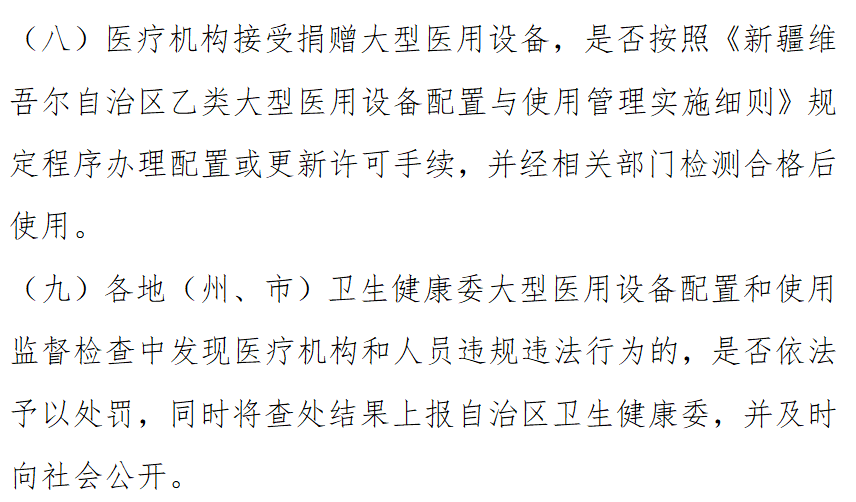 近日,新疆衛健委發布《關于做好大型醫用設備配置與使用監管核查工作的通知》(以下簡稱《通知》),開展醫療機構(含社會辦醫)大型醫用設備配置(更新)與使用監管核查工作。