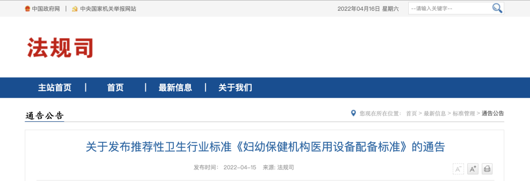 4月15日,國家衛健委發布推薦性衛生行業標準《婦幼保健機構醫用設備配備標準》的通告,本標準確立了各級婦幼保健機構醫用設備配備的總體要求和基本原則,并對設備分類、品目和數量進行了規定。