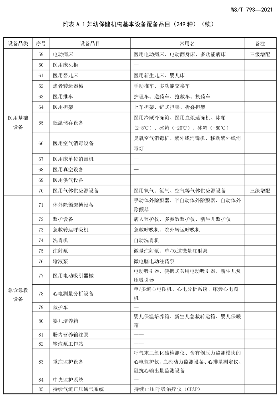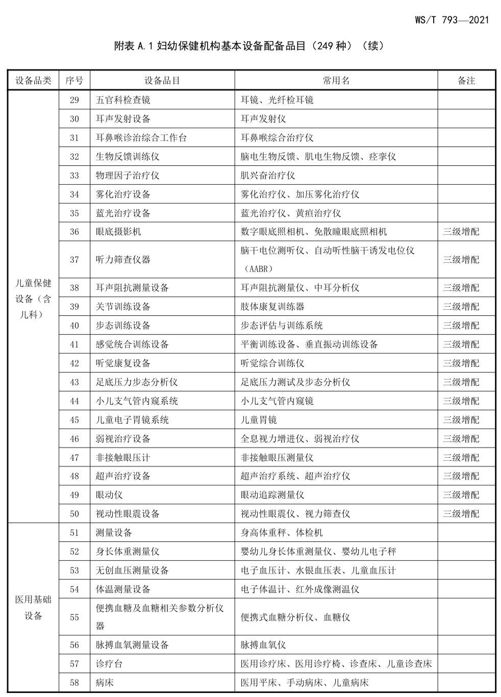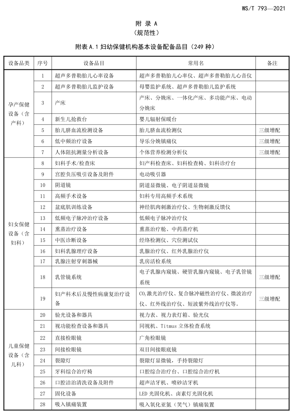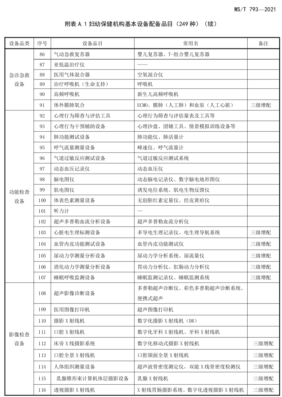 二級婦幼保健機構基本設備品目193種,三級婦幼保健機構在二級婦幼保健機構基本設備品目基礎上增配 56 種,具體品目按照附錄 A 的規定。有條件的二級婦幼保健機構可參照三級婦幼保健機構標準選配。