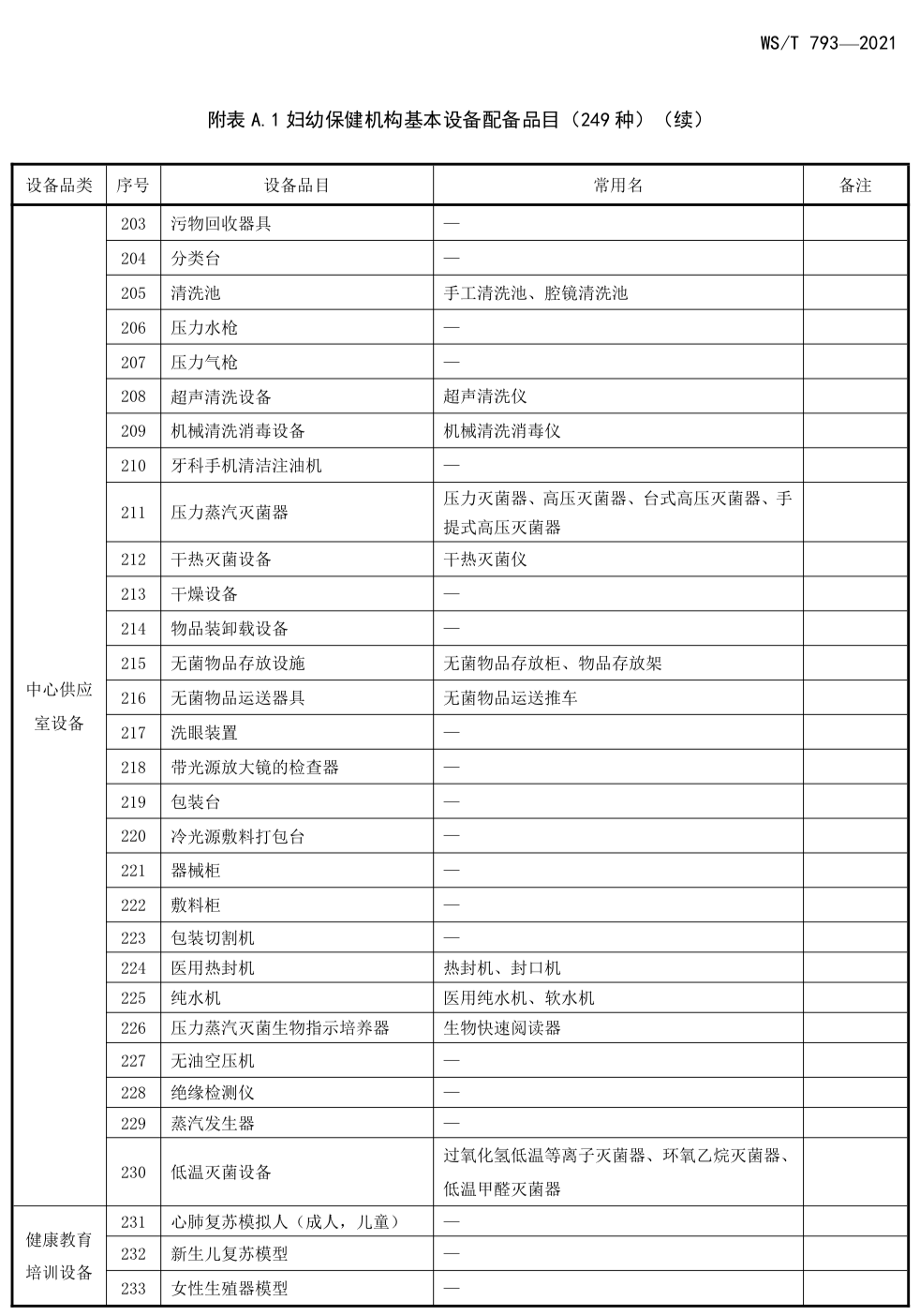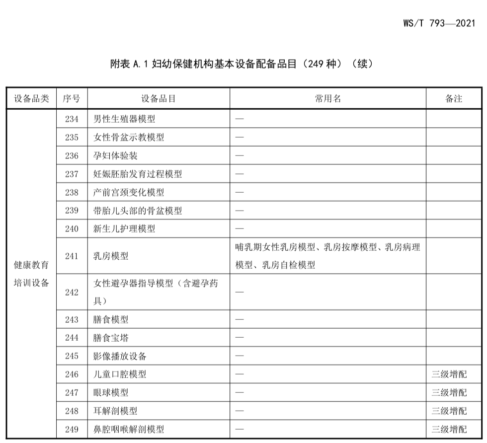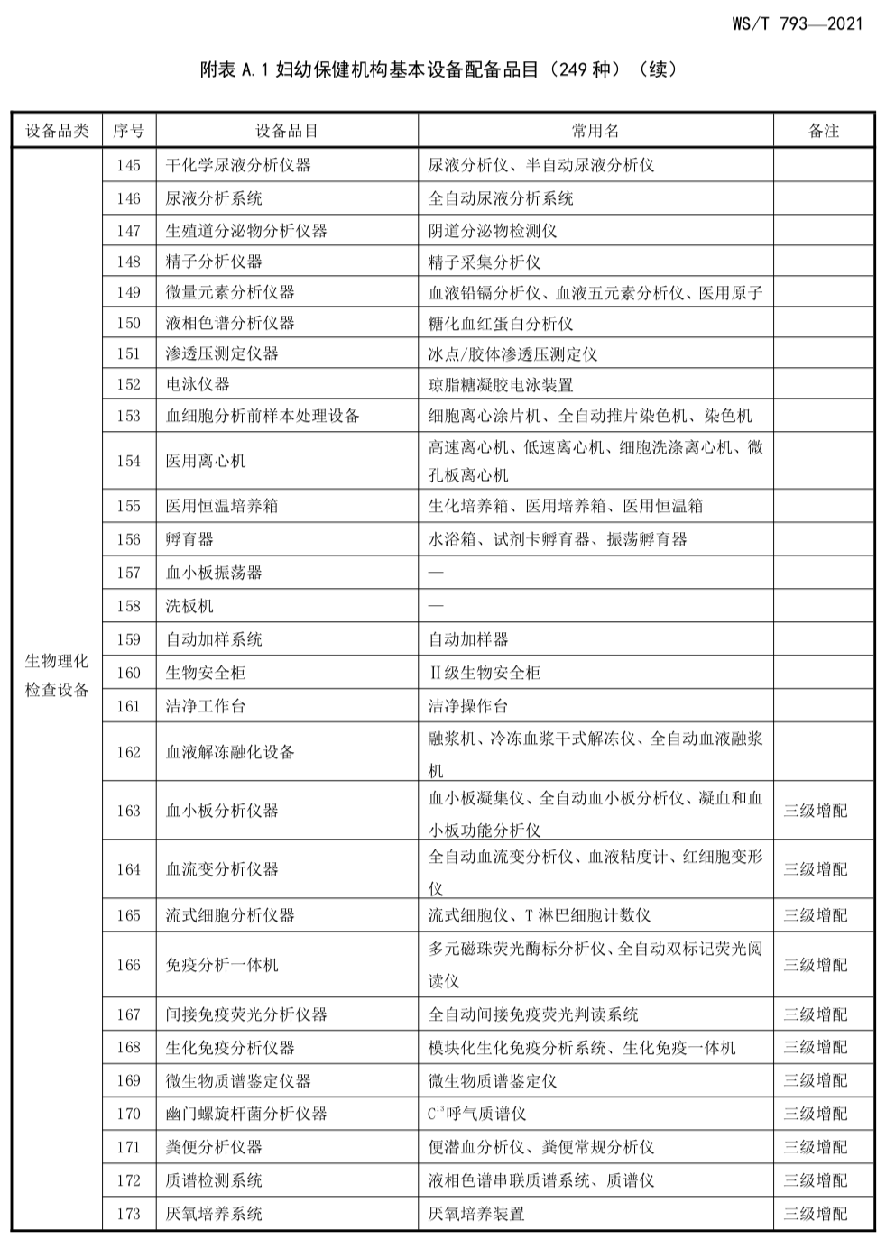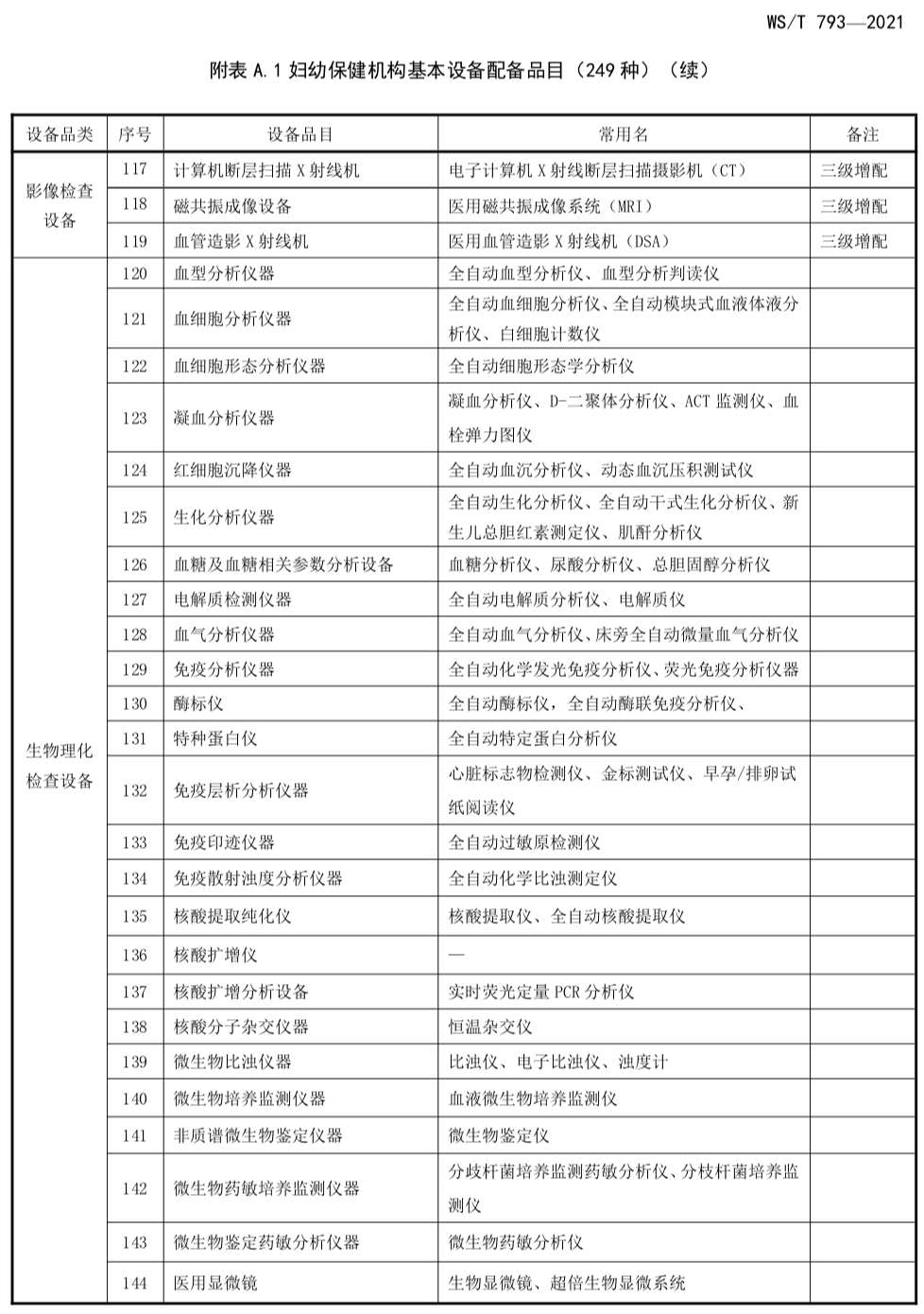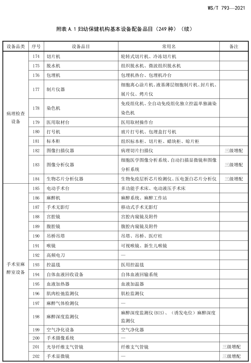 二級婦幼保健機構基本設備品目193種,三級婦幼保健機構在二級婦幼保健機構基本設備品目基礎上增配 56 種,具體品目按照附錄 A 的規定。有條件的二級婦幼保健機構可參照三級婦幼保健機構標準選配。