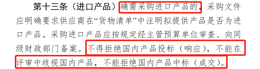 并且,不得拒絕國內(nèi)產(chǎn)品投標(biāo)、響應(yīng),不能在評審中歧視國內(nèi)產(chǎn)品,不能拒絕國內(nèi)產(chǎn)品中標(biāo)、成交。