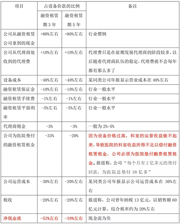 公司現金流斷裂,這種游戲也就再也玩兒不下去了,公司、醫院、融資租賃公司各方的風險也就暴露無余了: