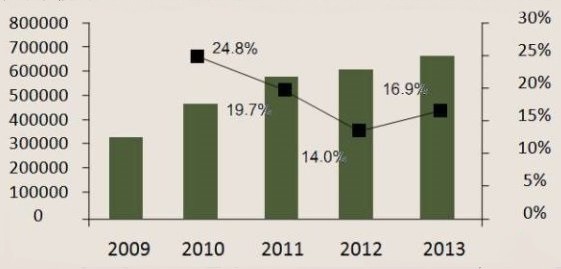 從2009~2013年的數據來看,國內支架數量的使用仍在逐年上升,這個“蛋糕”仍在發酵膨脹,但膨脹速度有所放緩(圖3)。