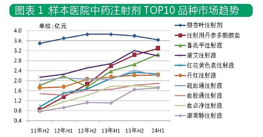 在控費的壓力下,中藥注射劑市場的增長趨勢可能會有所減緩,其中較為明顯的無疑是部分定位為輔助用藥的中藥注射劑品種。根據CFDA南方醫藥經濟研究所城市樣本醫院中藥數據庫,2014年上半年最暢銷的十大中藥品種均為注射劑,不過,與前幾年的高速增長相比,除注射用丹參多酚酸鹽和喜炎平兩個新型注射劑外,其余暢銷品種普遍增長乏力,甚至出現了負增長。