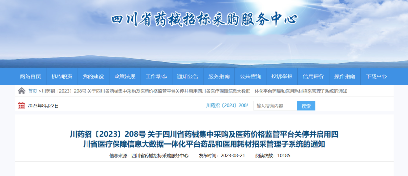 8月21日,四川省藥械招標(biāo)采購服務(wù)中心發(fā)布《川藥招〔2023〕208號 關(guān)于四川省藥械集中采購及醫(yī)藥價格監(jiān)管平臺關(guān)停并啟用四川省醫(yī)療保障信息大數(shù)據(jù)一體化平臺藥品和醫(yī)用耗材招采管理子系統(tǒng)的通知》。