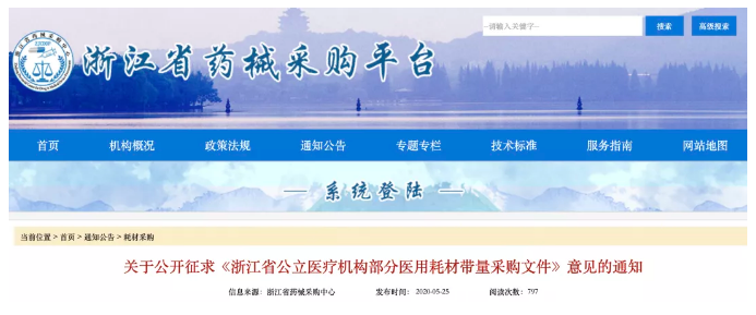 (5月25日),浙江省藥械采購中心根據浙江省醫療保障局《浙江省公立醫療機構部分醫用耗材帶量采購工作方案(征求意見稿)》,擬訂了《浙江省公立醫療機構部分醫用耗材帶量采購文件(征求意見稿)》。