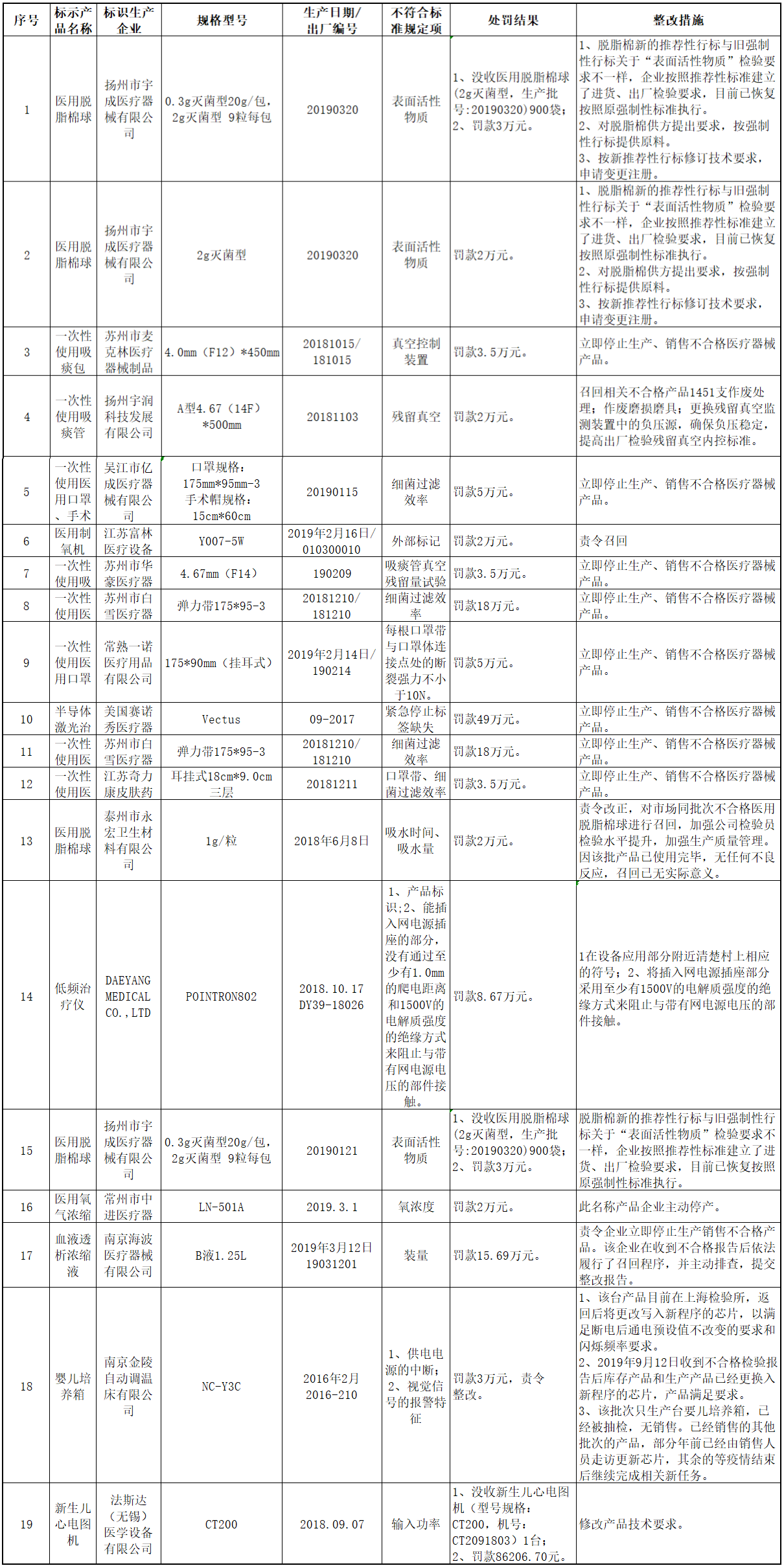 除了械企停產(chǎn),近期,江蘇省藥監(jiān)局還發(fā)布了《江蘇省醫(yī)療器械國抽通告(2019年第8號)處置情況匯總表》。