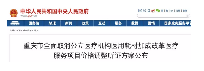 11月9日,據(jù)國務(wù)院官網(wǎng)消息,重慶市發(fā)展改革委召開新聞通氣會,發(fā)布《關(guān)于召開重慶市全面取消公立醫(yī)療機構(gòu)醫(yī)用耗材加成改革醫(yī)療服務(wù)項目價格調(diào)整聽證會的通告》。