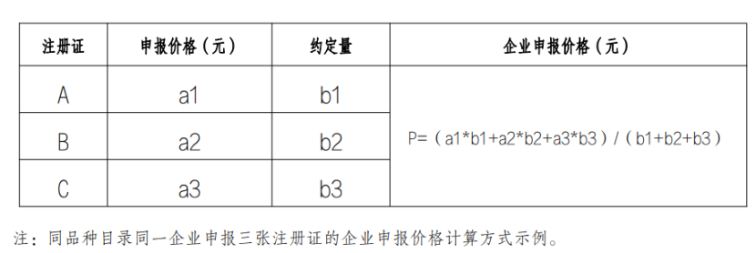 1.申報(bào)價(jià)格。同注冊證管理類別同品種目錄內(nèi),同一企業(yè)只有一張注冊證的,該注冊證申報(bào)價(jià)格作為企業(yè)申報(bào)價(jià)格。同注冊證管理類別同品種目錄內(nèi),同一企業(yè)有多張注冊證的,每張注冊證確定一個(gè)申報(bào)價(jià)格,每張注冊證的申報(bào)價(jià)格≤同品種目錄本企業(yè)其他注冊證申報(bào)價(jià)格的1.3倍,將各注冊證對應(yīng)的約定采購量作為權(quán)重,通過加權(quán)平均方法計(jì)算出企業(yè)申報(bào)價(jià)格。