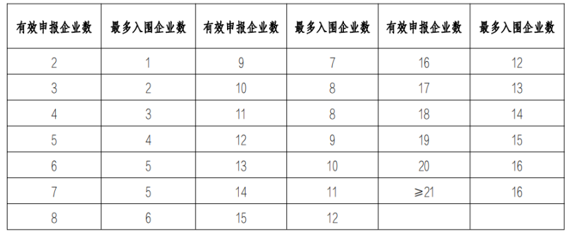 2.入圍企業(yè)。同注冊證管理類別同品種目錄內(nèi),依據(jù)企業(yè)申報(bào)價(jià)格按照由低到高的順序確定排名,申報(bào)價(jià)格最低的為第一名,次低的為第二名,以此類推。最多入圍企業(yè)數(shù)量見下表。企業(yè)申報(bào)價(jià)格相同的,醫(yī)療機(jī)構(gòu)申報(bào)約定采購量大的排名靠前。