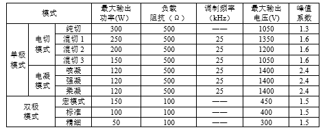 ●本手術(shù)設(shè)備的單極模式包含單極電切和單極電凝模式,其中電切模式包含純切、混切1、混切2和混切3,輸出功率均可調(diào)。