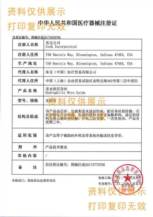 該產品由芯絲、包被和親水涂層組成,配有導絲扭控器。芯絲由鎳鈦合金制成,包被的材料為聚亞氨酯和鎢,涂層的材料為聚乙烯吡咯烷酮。環氧乙烷滅菌,一次性使用,產品有效期3年。